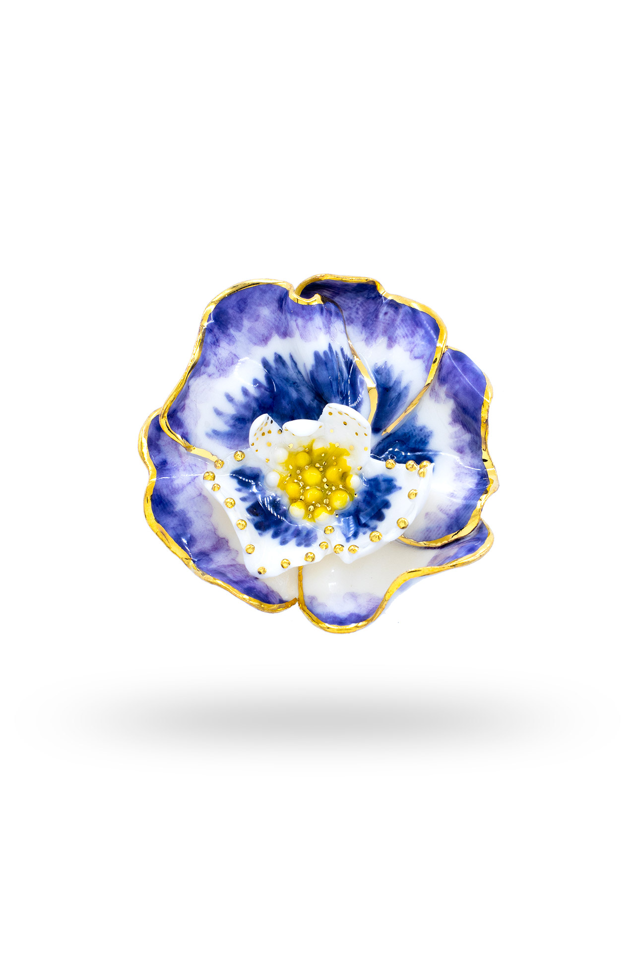 Broche florale en porcelaine peinte à la main, pièce unique créée dans notre atelier. Façonnée avec soin et ornée de détails en or 24 carats, cette broche élégante exprime la délicatesse de la nature dans un accessoire intemporel, idéal pour des tenues féminines et raffinées.